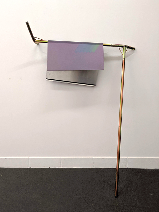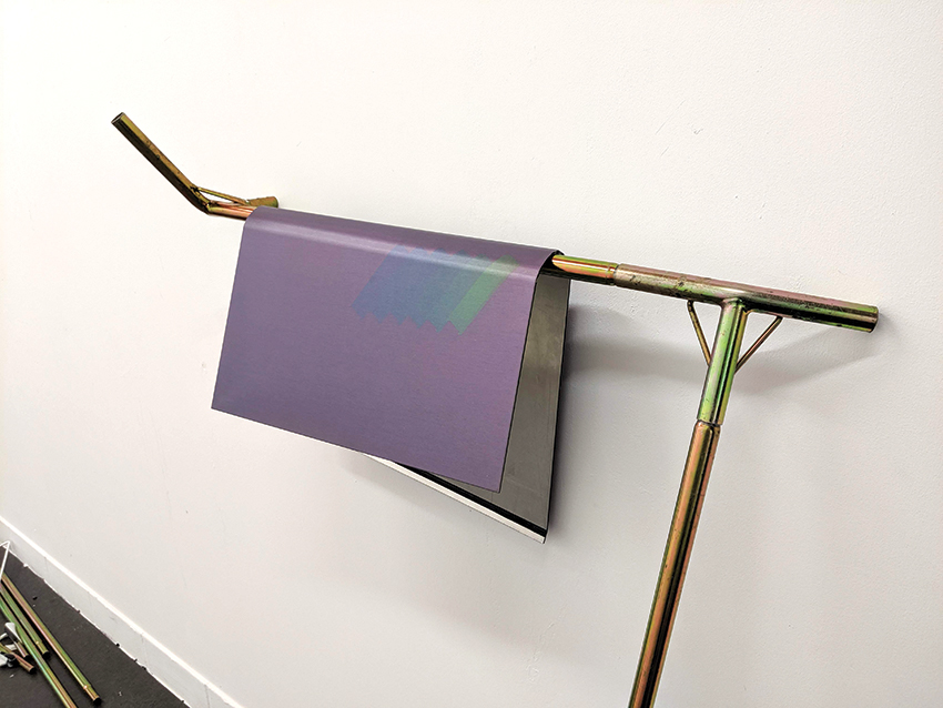 Actinique récupère Insolations comme souvenir de la graphie, contact au langage, ici fixé par impression sur dibond. Les impressions sont courbées,et découpées pour créer une sensation de gravité et compléter la fonction de la structure métallique qui les porte. Les fonctions évoquées d’étagère, de vestiaire, d’enseigne ou de lampe sont conçues pour supporter les dibonds et amplifier le sens des insolations. La structure métallique qui les constituent est faite de fragments d’ossatures de tentes, habitats mobiles, en acier bichromaté. Créer des extensions d’abris qui permettent des usages symboliques. Ici, le travail de l’objet et de la sculpture sont mêlés par des problématiques identiques. La nécessité de la forme pour établir un lien spirituel aux choses et au vêcu (héritage et histoire sociétale), l’objet qui revient à questionner l’industrie, la nécessité de la fonction, et la possibilité de la sculpture à vivre.