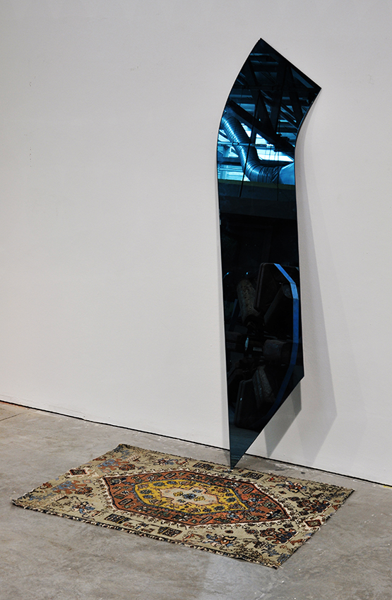 Beau tapis orienté sud-est accentue la perte des marques de l'origine des éléments qui la constituent. Pour identifier un tapis, il faut observer la base du noeud, elle a été retirée du tapis. La révolution islamiste de 79 a transformé l'état d'Iran en république Islamique et a initié un embargo sur les tapis persans, ces derniers considérés comme "trésor national". Le miroir taillé en signe de ponctuation crée un lien entre topies.
