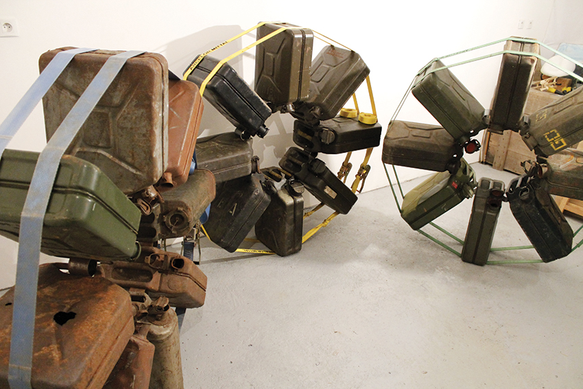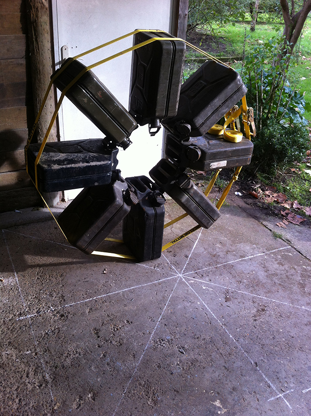 Des jerricans américains, français, et allemands s’associent, se mettent en tension et chauffent autour d’une resistance électrique visible sur la première photo, suspendue à portée de main, atteignant les 400 °C. Les bidons sont ouverts et une odeur légère d’essence se dégage de quelque bidon. Flower Power inspire une crainte de l’explosion heureusement infondée. L’assemblage fige l’icône ainsi créée.