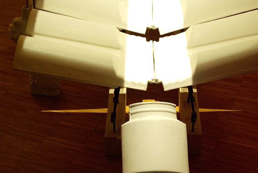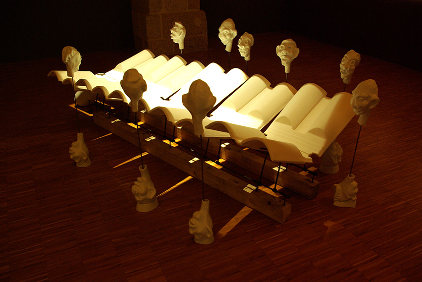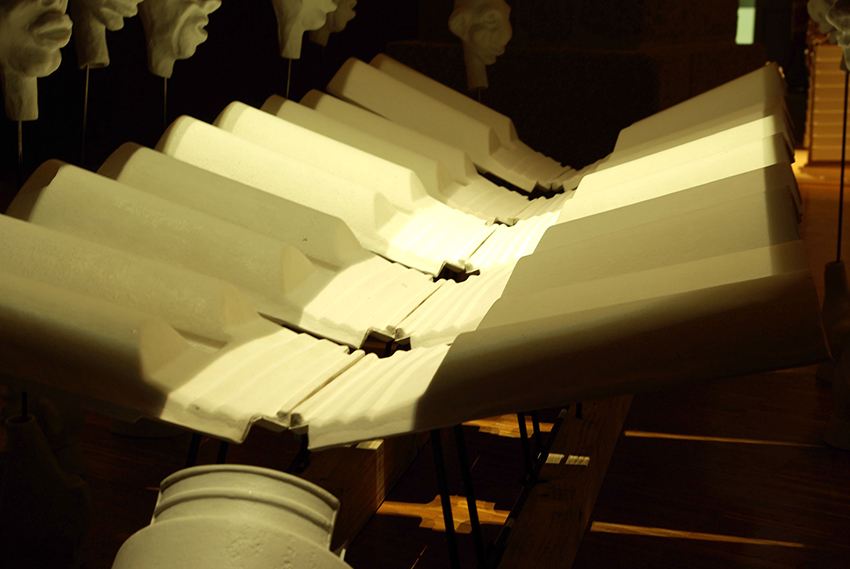 Les maillons de la chaîne sont désordonnés : le plâtre, incontournable matière des moules, le bois, support des coffrages, forment l’armature de la table de laquelle s’écoule la matière absente, dans une céramique. Les procédés de modelage et moulage agissent comme teneurs de l'expérience, de leur naissance à la notion d'espace.