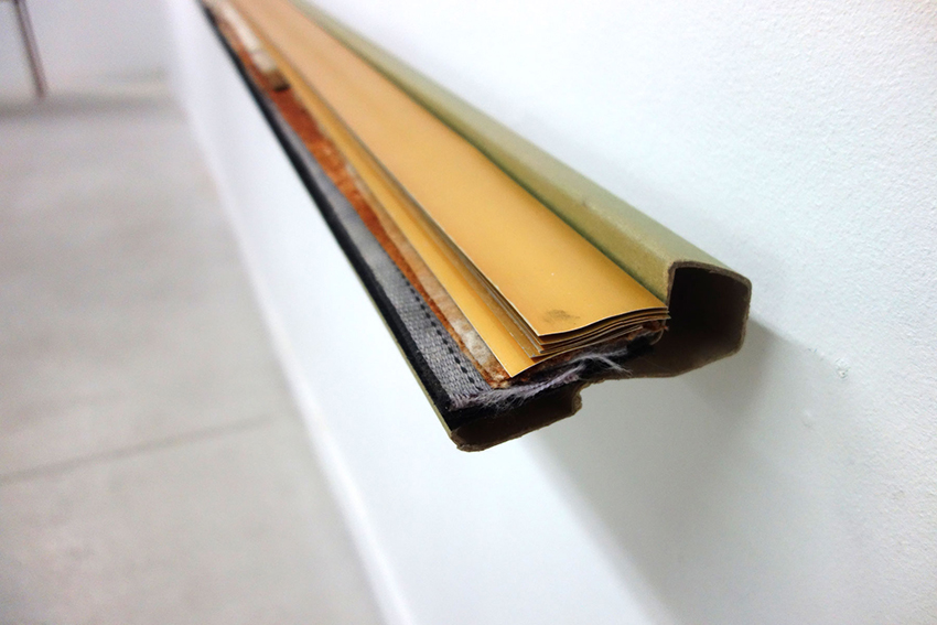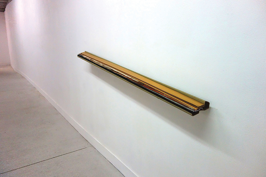 Main courante et droite courbe est constituée d’une succession de matériaux issus de nombreux sites abandonnés alentours. Ce procédé de prélèvement a été répété sur plusieurs formes d’ouvrages, parfois circulaires. Une projection orthogonale représentant l’objet en filaire (arêtes et contours) de l’assemblage en anamorphose est créée à son droit.