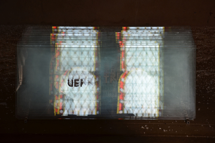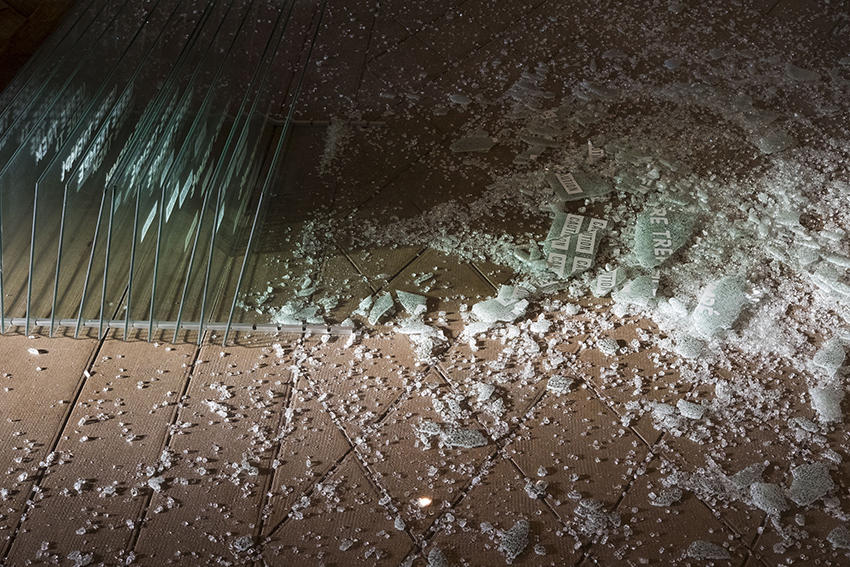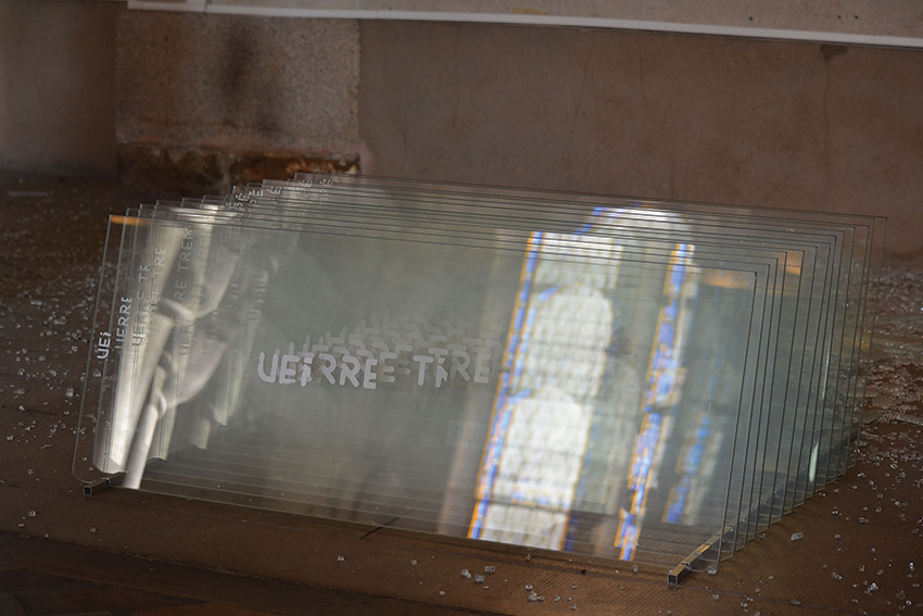 Verre trempé est constituée d’une succession de 18 plaques de verre sur lesquelles apparaissent progressivement les lettrages en abscisse et en ordonnée. La pièce créée in situ dans un ancien réfectoire jésuite était brisée jusqu’à disparition. Verre trempé reflète les vitraux de la chapelle multipliée par 18 grâce au décalage de quelques centimètres entre les pièces en verre qui la constituent. La destruction de la dernière pièce de verre emporte avec elle le dernier reflet des vitraux dans une pièce où à l’origine, seuls les verres de tables ou de lunettes les reflétaient. Le vacarme de la casse fait écho au voeu de silence des Jésuites, le verre à la lumière.